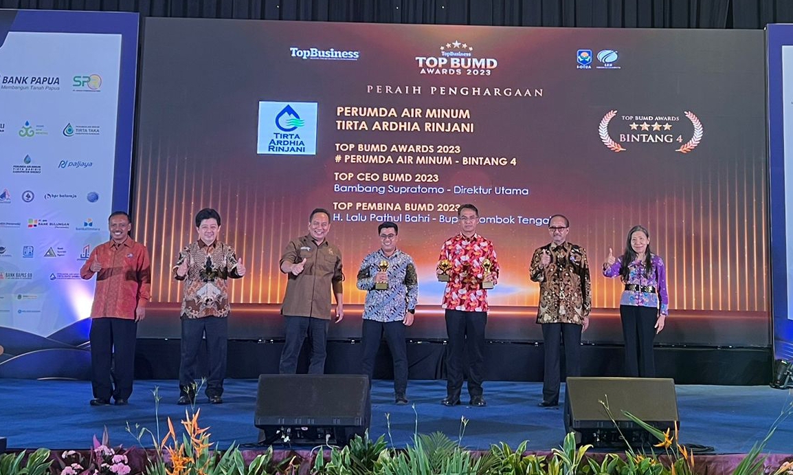 Lombok Tengah, kabarntb.id – Perumda Air Minum Tirta Ardhia Rinjani atau PDAM TIARA dalam acara puncak penghargaan TOP BUMD Awards 2023 menerima penghargaan TOP BUMD Awards 2023 Perumda Air Minum – Bintang 4, diikuti TOP CEO BUMD 2023 yang diberikan kepada Direktur Utama Bambang Supratomo, dan TOP Pembina BUMD 2023 untuk Bupati Lombok Tengah H. Lalu Pathul Bahri, di Ballroom Hotel Raffles Kuningan – Jakarta.
